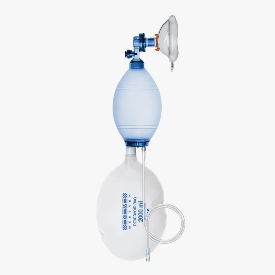 Аппараты искусственной вентиляции легких ручные MEDEREN имеют прозрачную одноразовую маску из ПВХ с мягкой раздувной манжетой и съемным кольцом для фиксации на голове пациента с цветовой маркировкой или многоразовую силиконовую маску без манжеты, вертлужный коннектор с осью вращения на 360°, структурированную поверхностью дыхательного мешка, благодаря которой он не выскальзывает из рук врача.