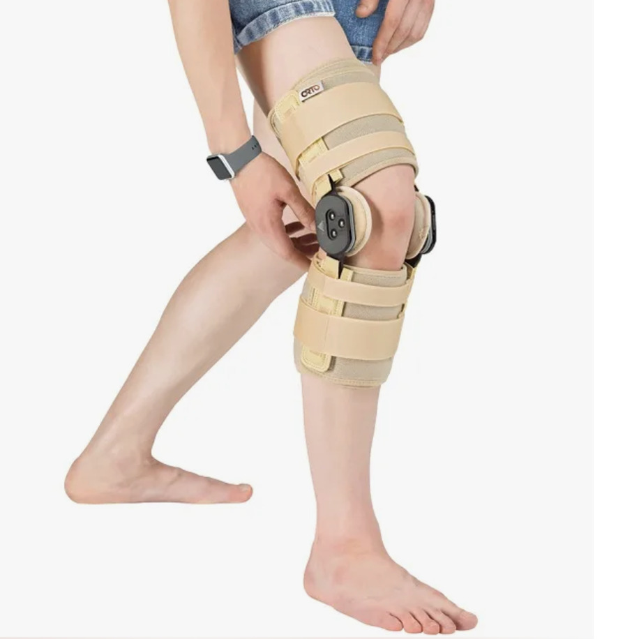 Ортез на колено (брейс) с основами на бедро и голень, жесткими шарнирными ребрами жесткости и секторными замками.