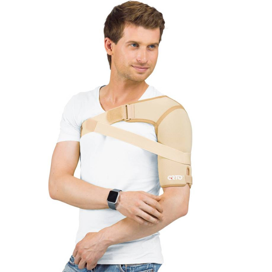 Эластичный ортез в виде рукава на левый плечевой сустав.