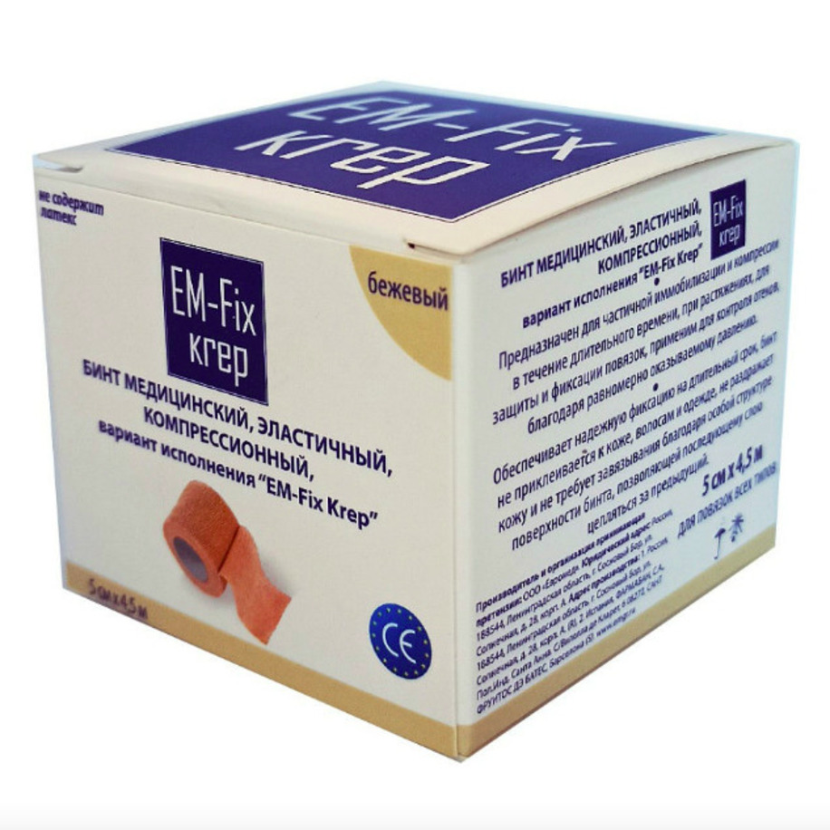 • Бинт медицинский эластичный когезивный (самофиксирующийся) стягивающий EM-Fix Krep обеспечивает надежную фиксацию на длительный срок.