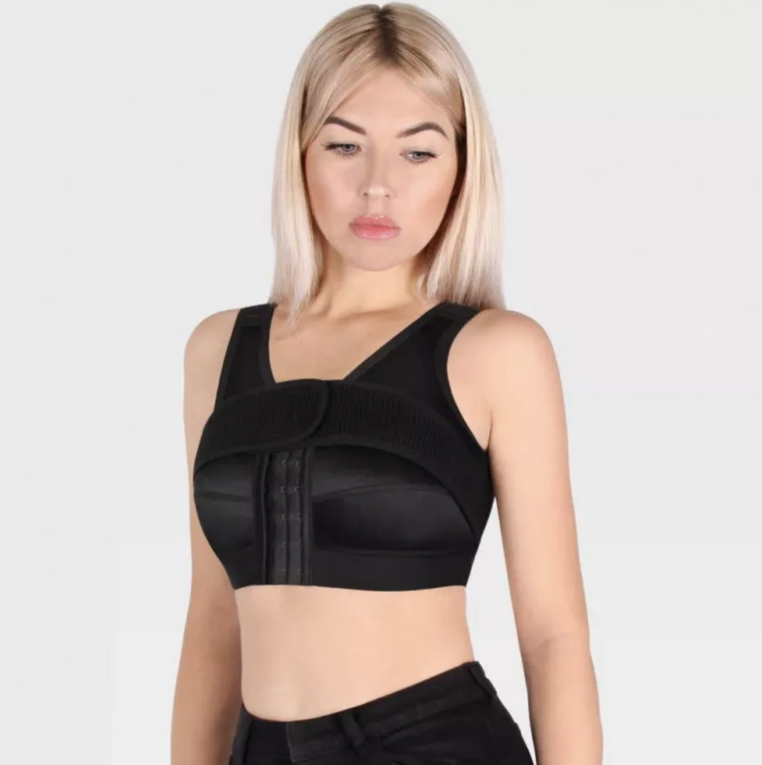 Компрессионный бюстгальтер бережно и равномерно фиксирует грудь, предотвращая ее подвижность, способствуя уменьшению болезненности после операции, а также предотвращает кровотечения и смещения импланта.