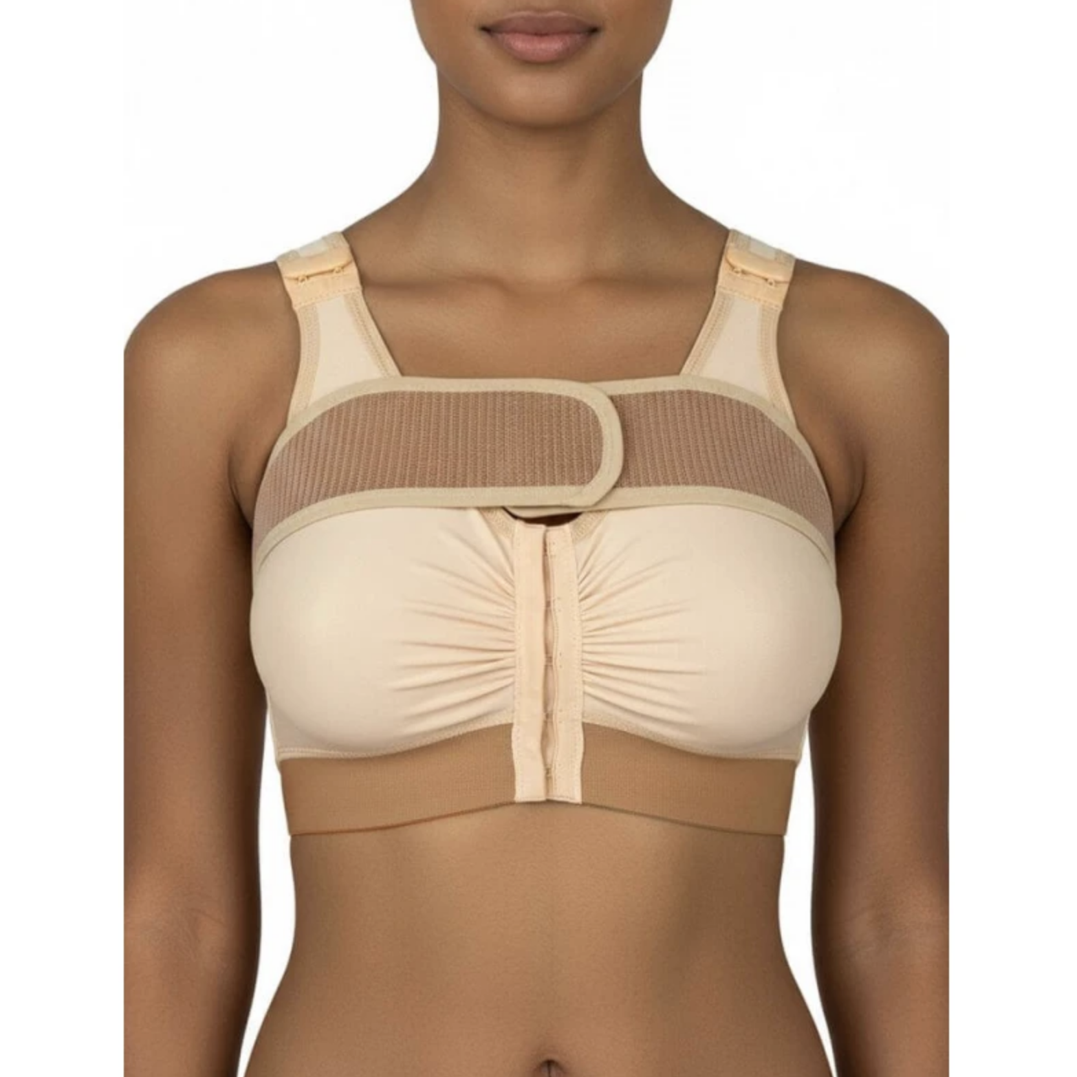 Лиф после операций на груди снабжен застежкой на крючках спереди и фиксирующей съемной эластичной лентой с застежкой «Velcro» для имплантов.