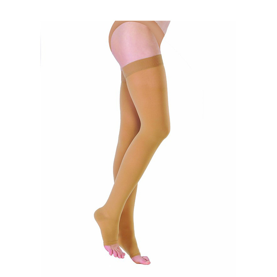 Такое распределение компрессии активизирует венозный отток, улучшает движение крови к сердцу, предотвращая развитие лимфотических и венозных отеков. Открытый мысок рекомендуется людям с нестандартной стопой (большого или маленького размера), для ношения изделия в летнее время с открытой обувью, способствует лучшему потоотведению. Чулки с открытым мыском более долговечны (не протирается и не рвется зона в области пальцев ног), их проще и легче надевать Укрепленная пяточная область продлевает срок использования изделия, а удобная силиконовая резинка обеспечивает комфорт при носке.