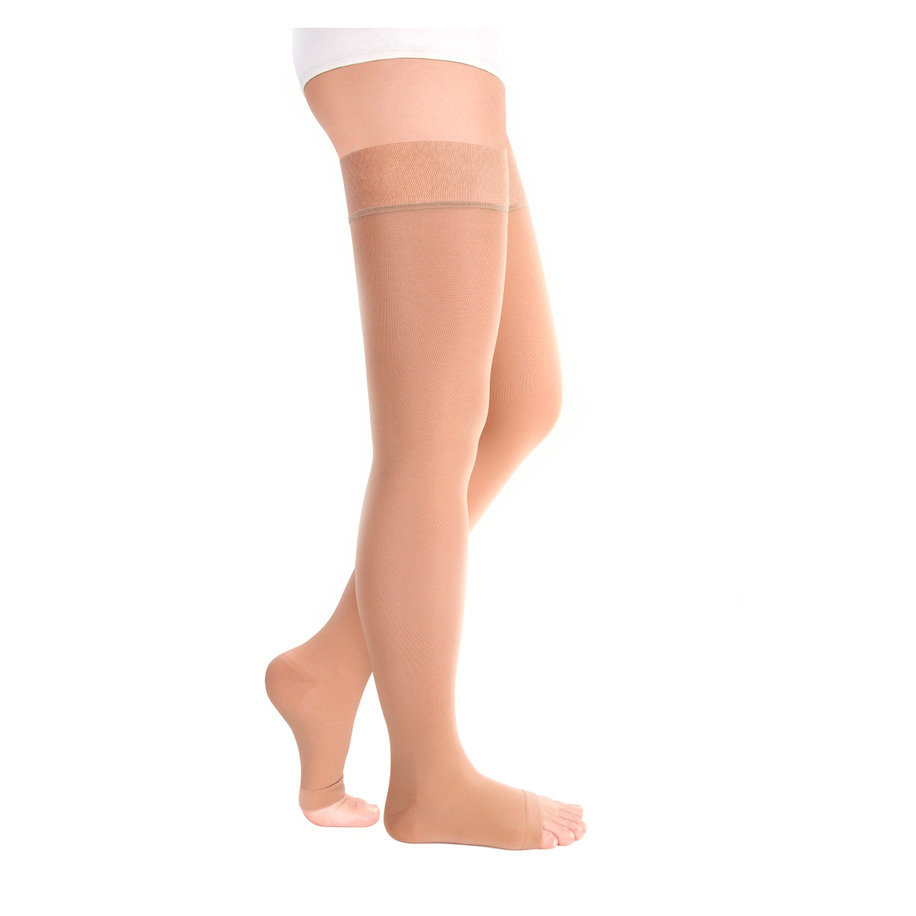 Резинка на силиконовой основе, в том числе на широкое бедро, мягко фиксирует чулок, не нарушая кровотока;