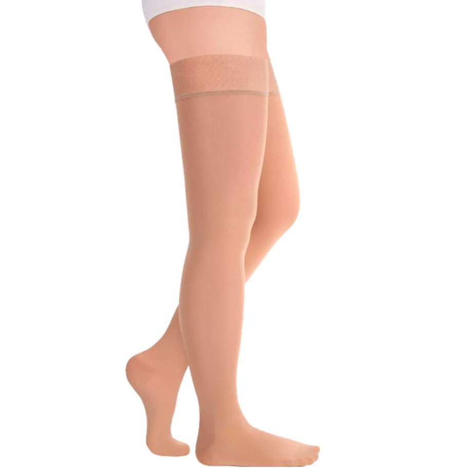 • Резинка на силиконовой основе, в том числе на широкое бедро, мягко фиксирует чулок , не нарушая кровотока.