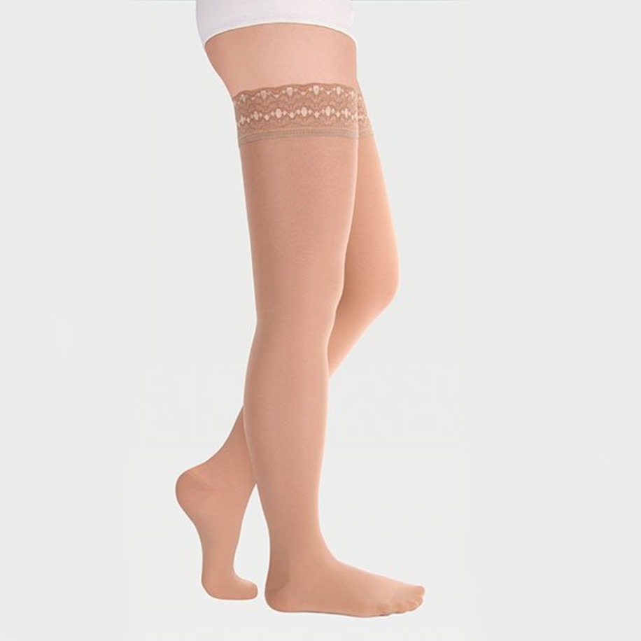 • резинка на силиконовой основе, в том числе на широкое бедро, мягко фиксирует чулок , не нарушая кровотока