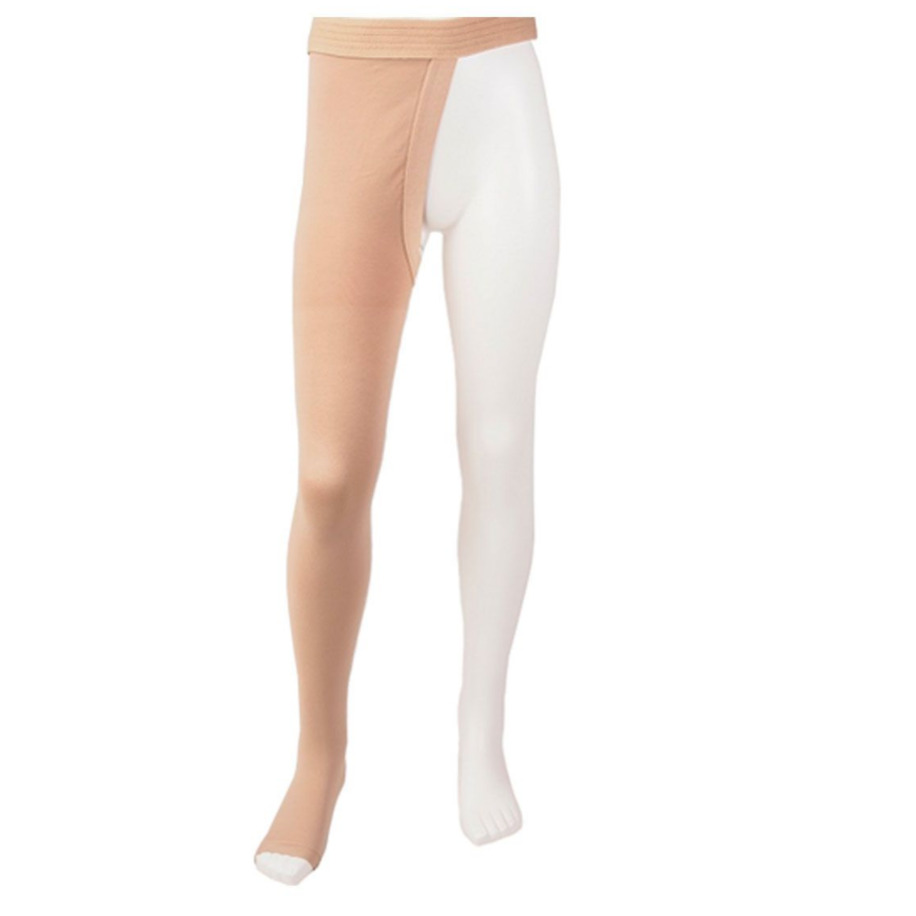 Компрессионная моноколгота с открытой носочной частью, оказывает воздействие на правую конечность, используется в случае развития заболевания на одной ноге.