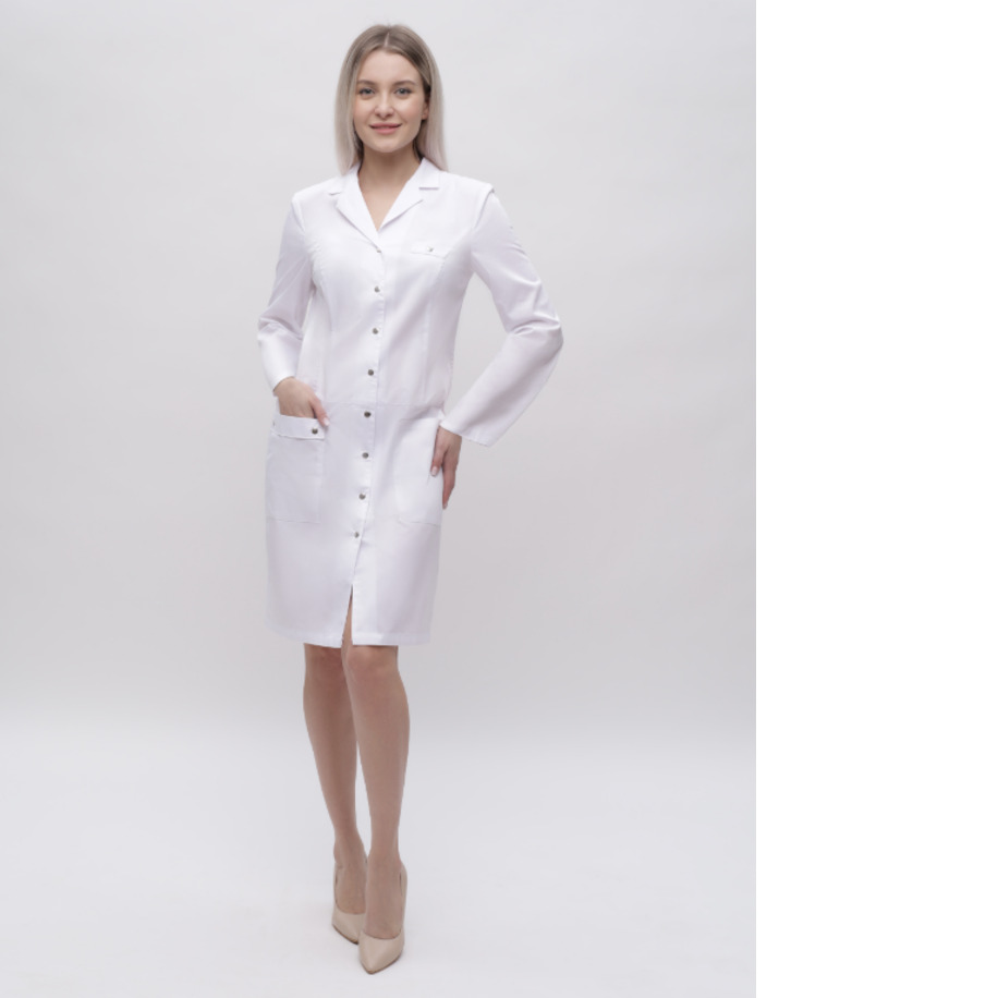 • Халат женский, полуприлегающего силуэта, с застежкой по борту на восемь металлических кнопок, отрезной ниже линии талии.