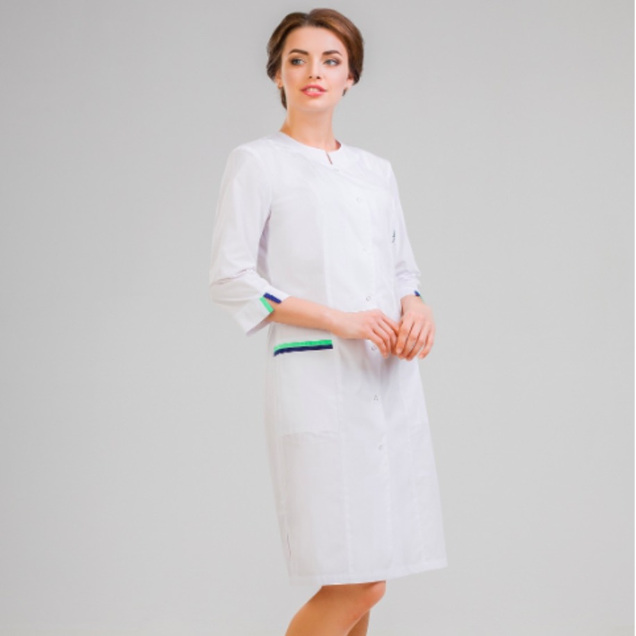 Халат приталенного силуэта, отрезное по линии груди, с центральной бортовой застежкой на 7 кнопок.