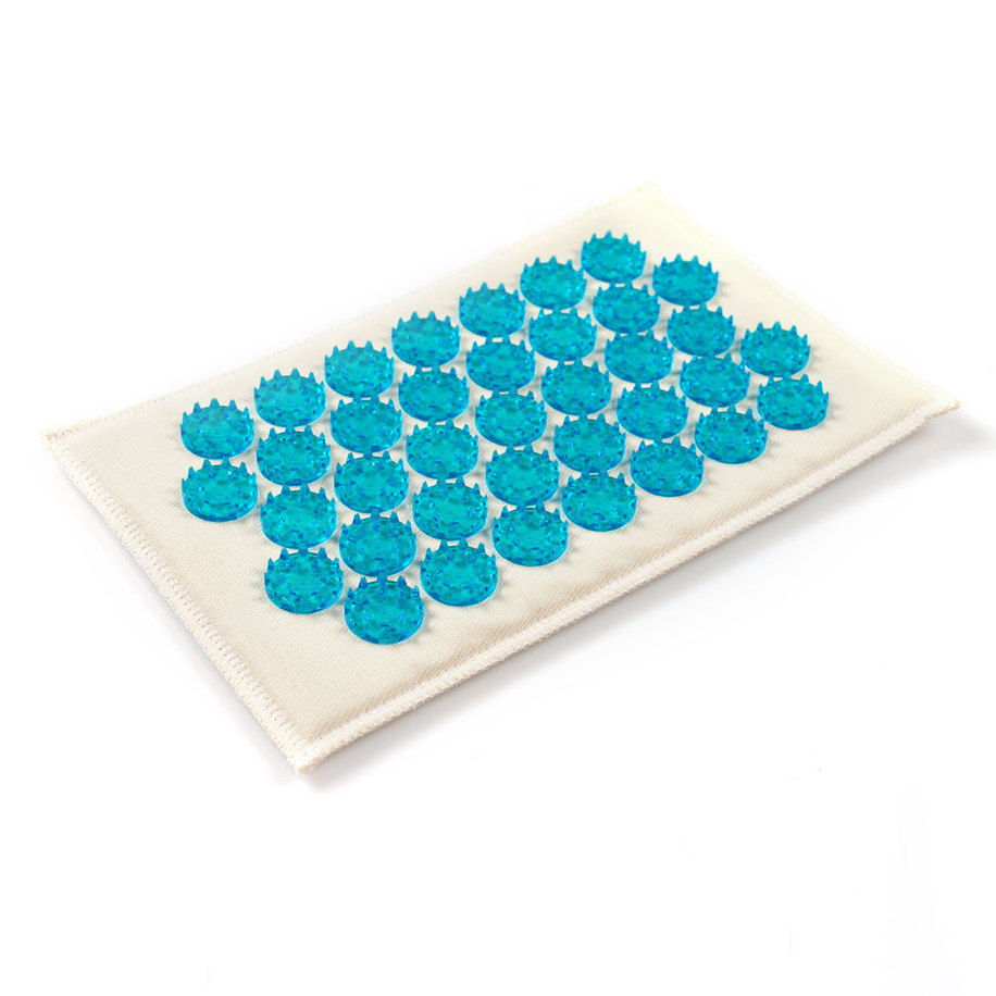 Малый массажный коврик 12х22 см – это натуральная хлопчатобумажная ткань с закрепленными на ней 37 синими аппликаторными модулями и иглами с двойным острием, которое не причиняет боли при проникновении под кожу в силу его небольшой глубины. Мягкая подложка обеспечивает оптимальную силу прижатия иппликаторных модулей, делая игольчатый массаж комфортным и эффективным.