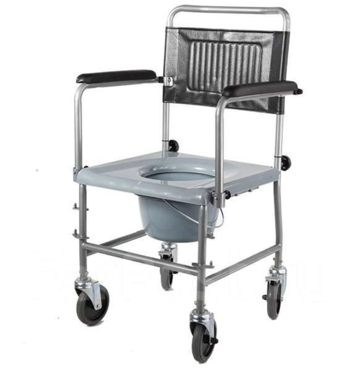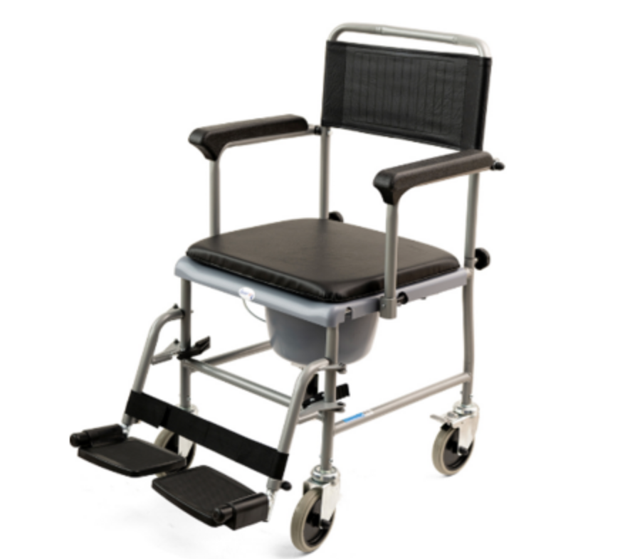 Кресло-каталка оснащена встроенным устройством для туалета, откидными подлокотниками и подножками.