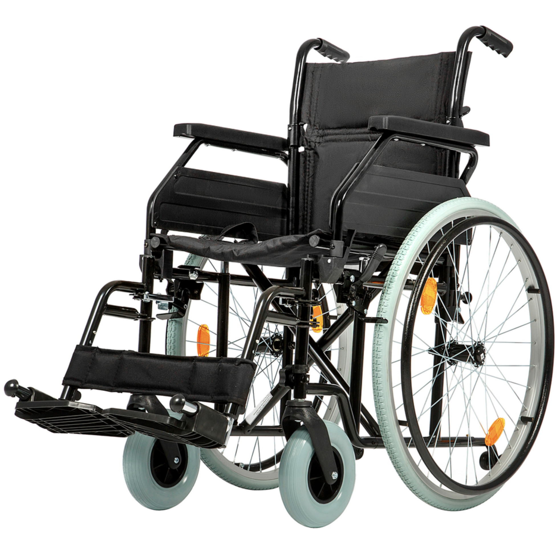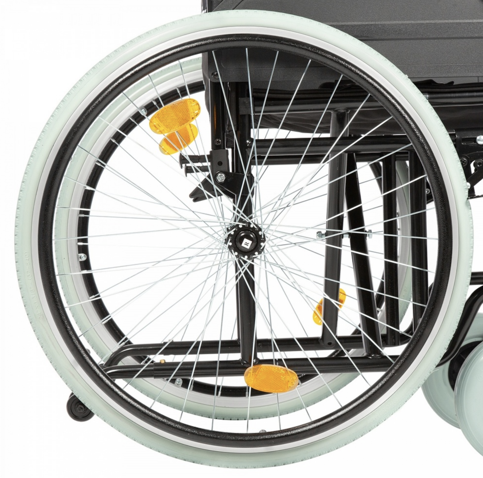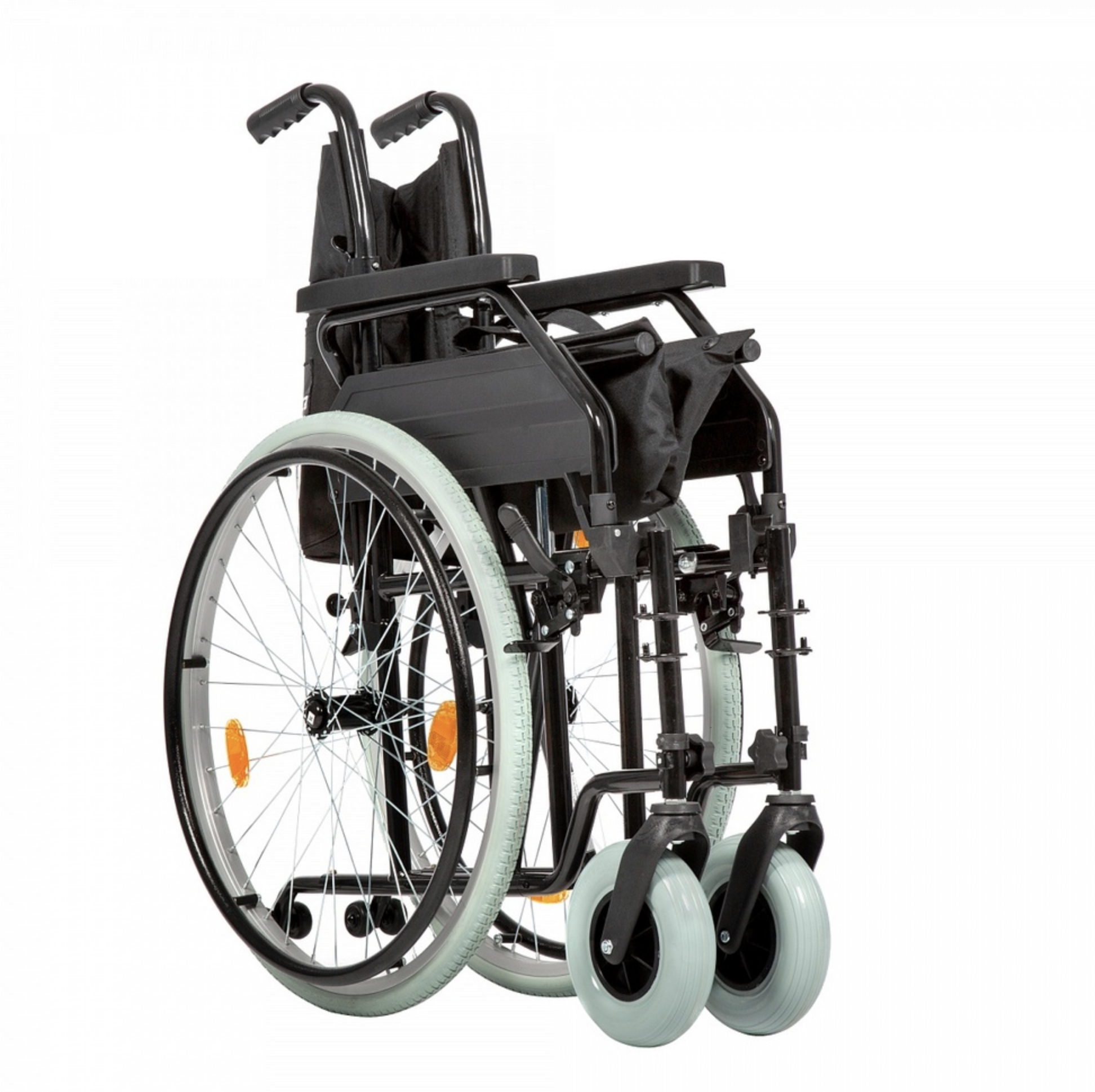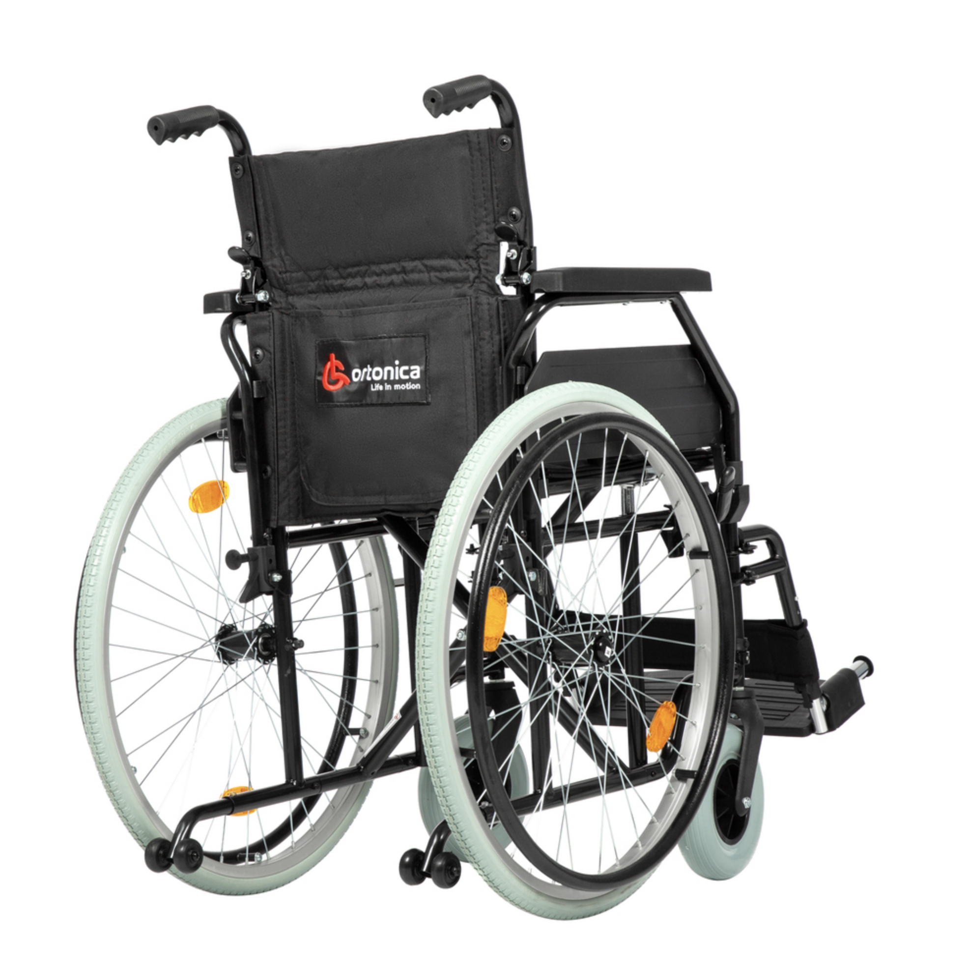 Кресло-коляска для инвалидов ORTONICA Base 400 имеет надежную стальную раму и высокопрочную синтетическую ткань на сидении и спинке.