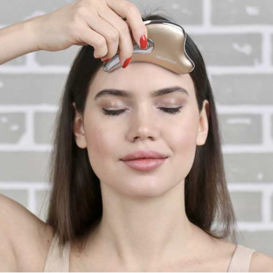 Оригинальный портативный прибор для комплексного ухода за кожей лица и шеи с использованием профессиональных методик: ионофореза, вибрационного массажа и глубокого прогрева тканей, выполнен в форме инструмента, используемого для косметического массажа гуаша.