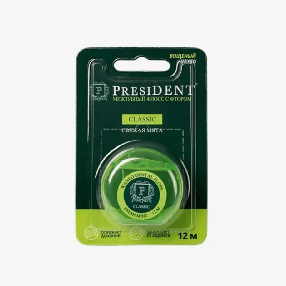 Межзубный флосс (вощеный) с хлоргексидином PRESIDENT Antibacterial удаляет остатки пищи и налет между зубами, борется с бактериями, вызывающими кариес и кровоточивость десен, подходит для любых межзубных промежутков.