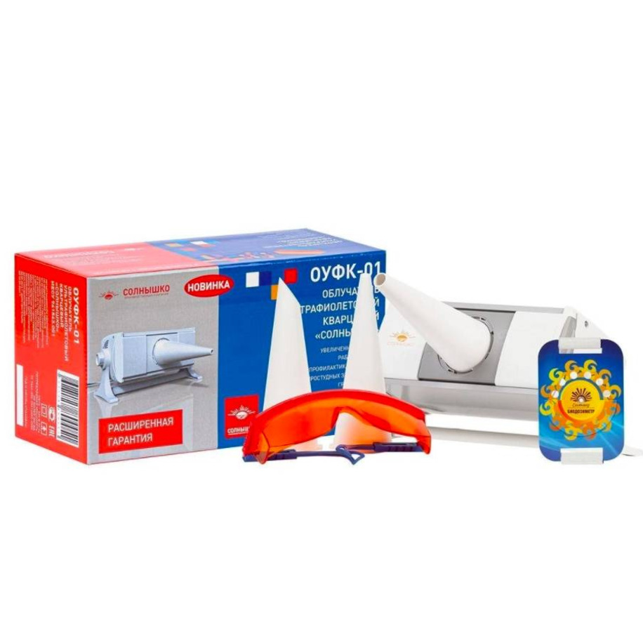 Облучатель ультрафиолетовый кварцевый ОУФк-01 "Солнышко"- 1 шт.; Очки защитные от УФ облучения — 1 шт.; Тубус с выходным отверстием Ø 5 мм — 1 шт.; Тубус с выходным отверстием Ø 15 мм — 1 шт.; Тубус с выходным отверстием под углом 60° — 1 шт.; Биодозиметр — 1 шт.; Руководство по эксплуатации; Инструкция по применению.