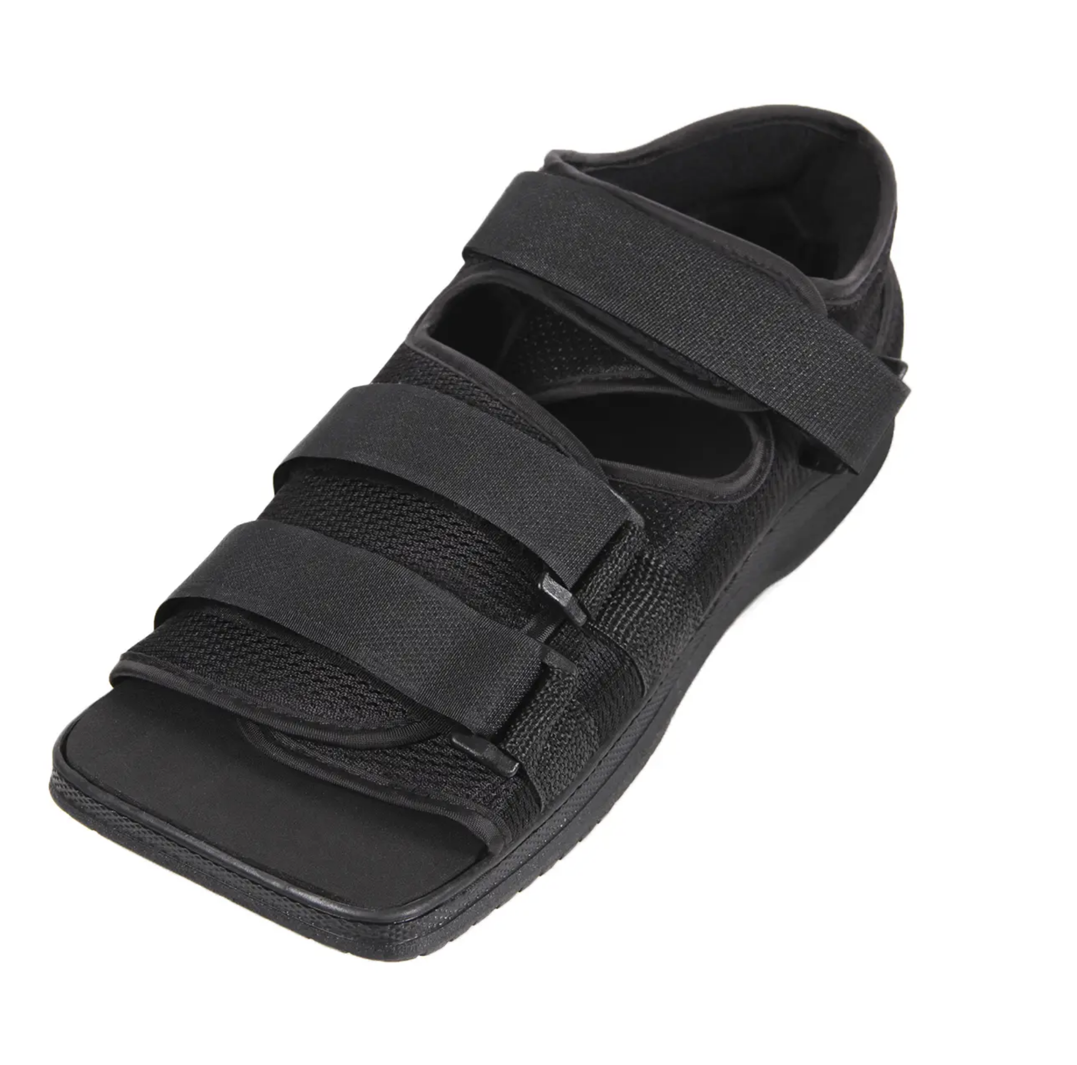 Cпециальная разновысотная форма подошвы со смещенной линией переката переносит нагрузку на непрооперированную пяточную часть стопы и разгружает передний отдел полностью раскрываемая конструкция и застежка «велкро», обеспечивающие легкое надевание обуви на послеоперационную повязку или на отекшую ногу