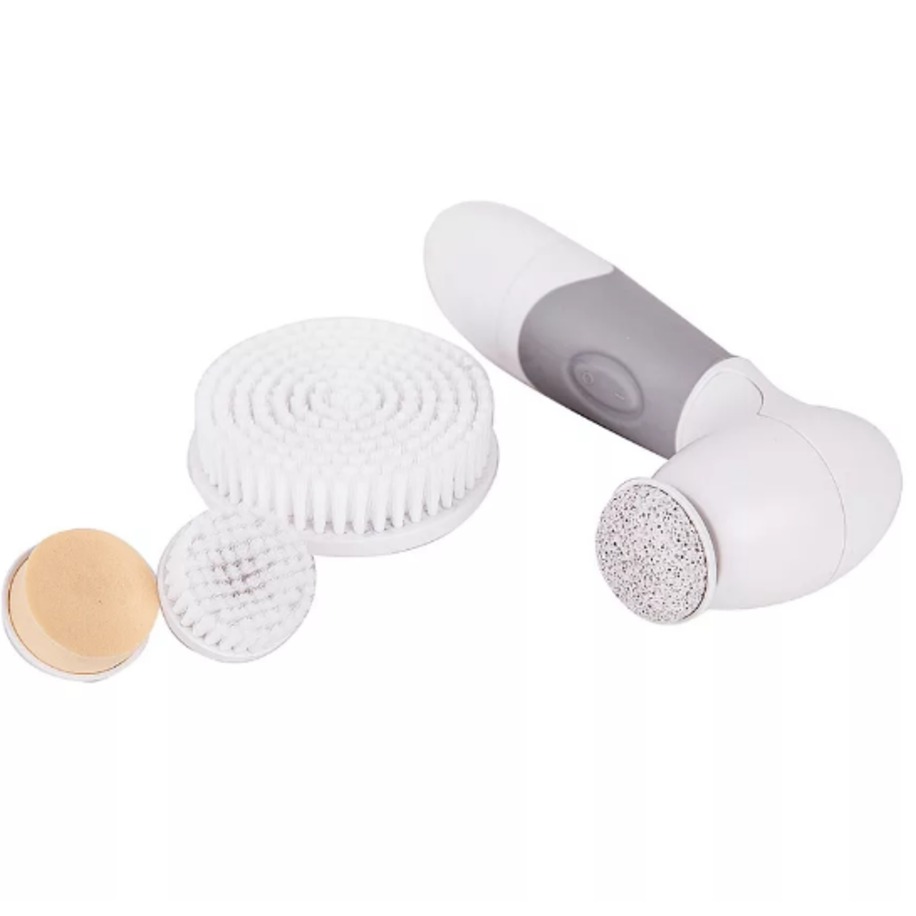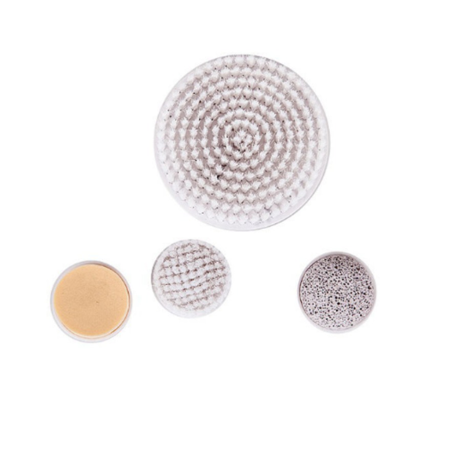 Имеет 4 сменные насадки (щетка для тела, щетка для лица, пемза, спонж).