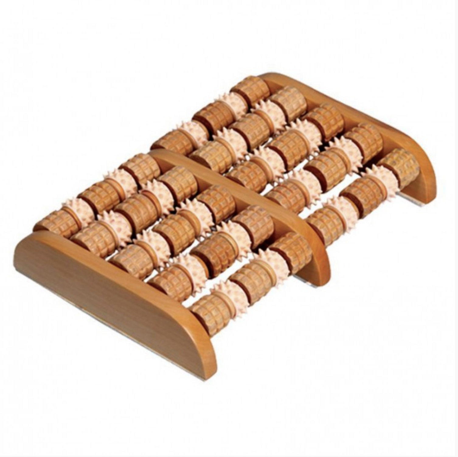 Массажер для ног выполнен из дерева, валики имеют пластиковое покрытие.