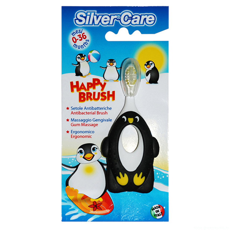 Зубная щетка Silver Care Happy Brush для малышей от 6 до 36 месяцев имеет небольшую закругленную головку, тем самым удобно помещаясь во рту ребенка, не повреждая десны, а также имеет невероятно мягкую щетину, которая без слез и хлопот справится с загрязнениями и налетом, не повреждая чувствительную эмаль малыша. Кроме всего прочего, кончики щетины обработаны серебром 999 пробы, что предотвращает появление и размножение бактерий.