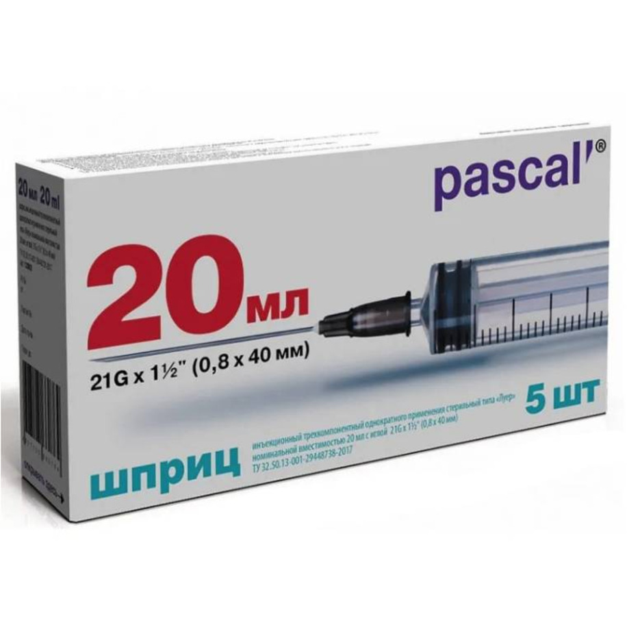 Шприц стерильный одноразовый инъекционный 3-х компонентный с иглой 21G 20 мл «Паскаль»