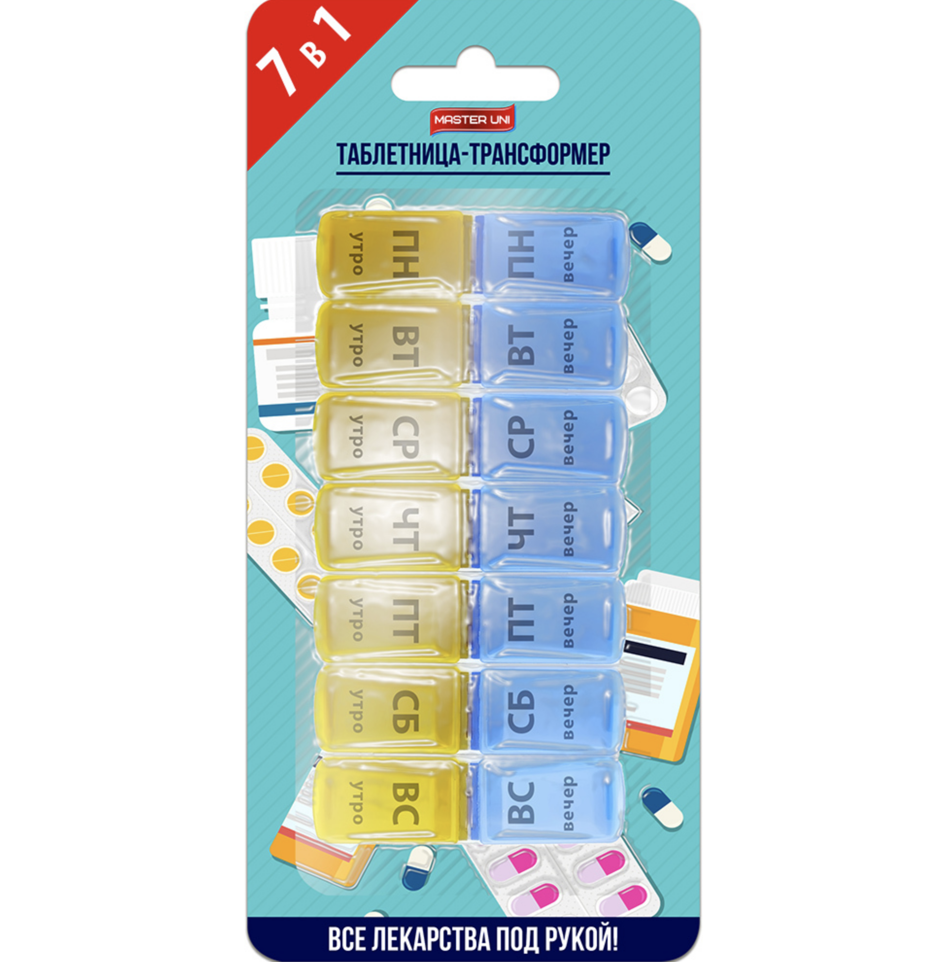 Содержит 7 отделяемых друг от друга мини-контейнеров, которые соответствуют дням недели: ПН, ВТ, СР, ЧТ, ПТ, СБ и ВС.