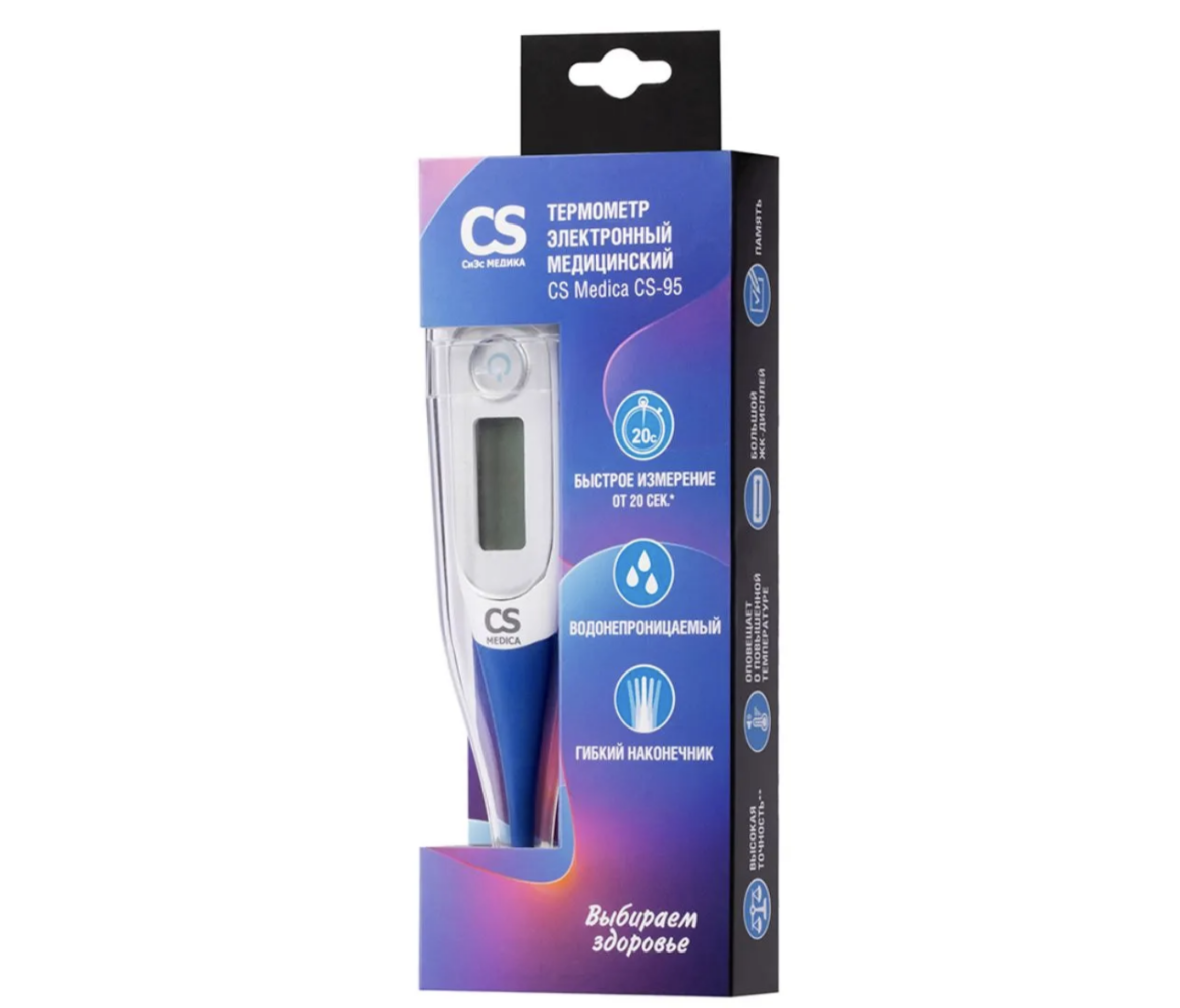 Электронный термометр CS Medica CS-95 — высокоточный прибор с большим дисплеем и мягким наконечником для измерения тела ректальным, аксиллярным и оральным способами взрослым и детям.