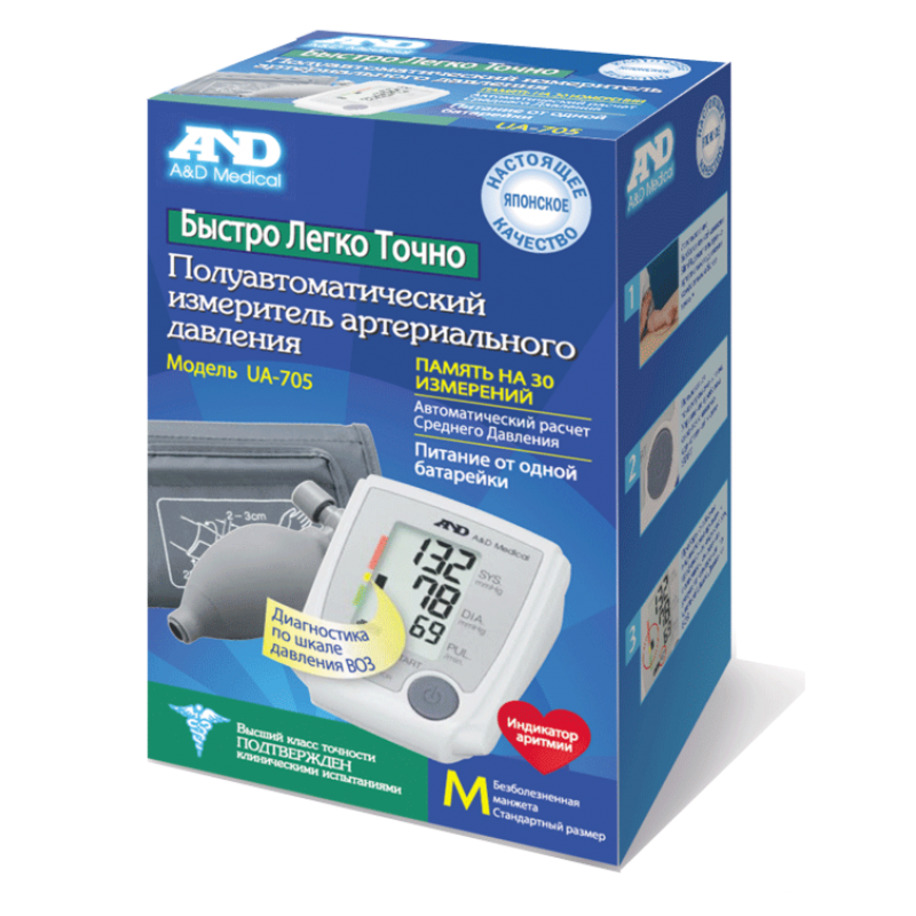 Модель UA-705 тонометра полуавтомата от японской компании AND с высококонтрастным трёхстрочным дисплеем является удобной для использования дома и в дороге, благодаря своим небольшим габаритам.