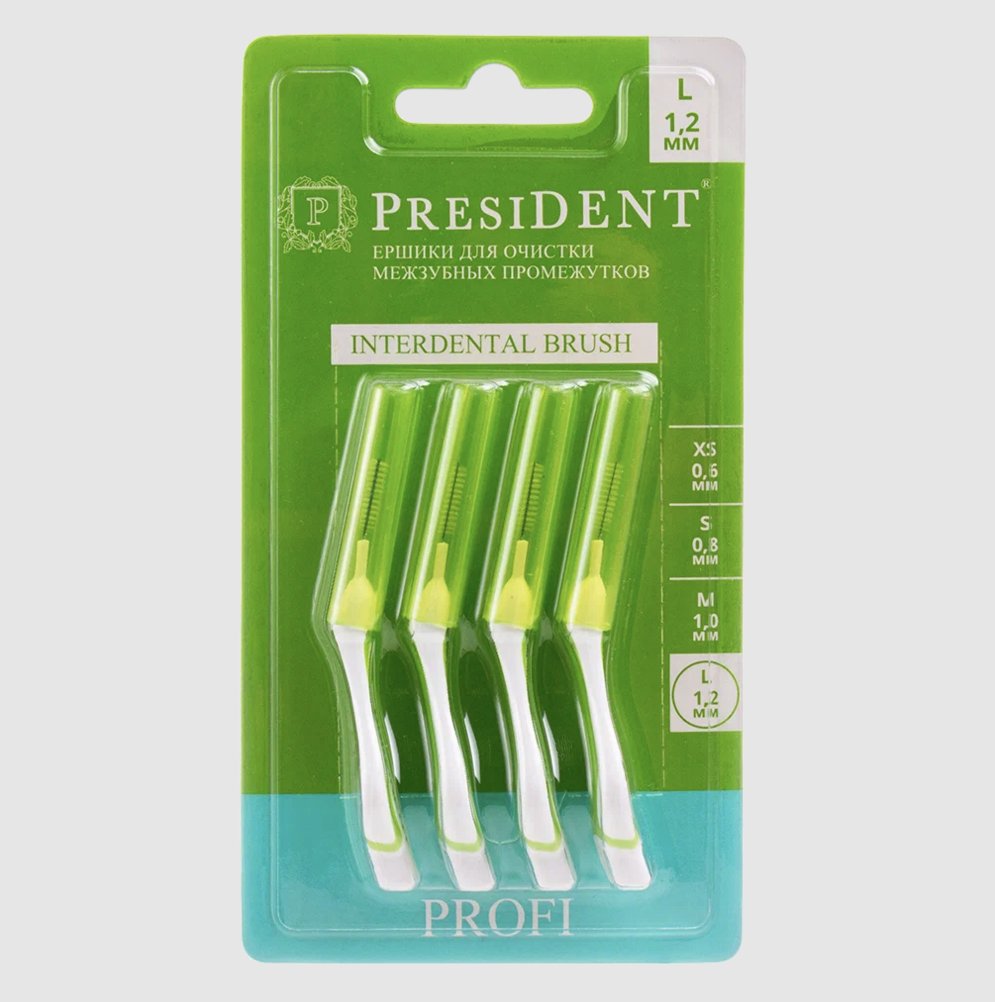 Ёршики для очистки межзубных промежутков PRESIDENT L диаметром 1,2 мм подходят для очистки межзубных промежутков, брекетов, мостов, обеспечивая эффективное очищение труднодоступных мест.