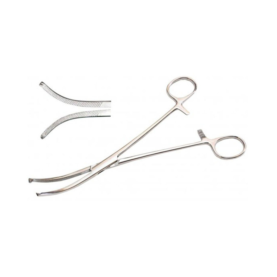 Это устройство шарнирного типа с замком и изогнутой по горизонтальной плоскости рабочей части. Подобное медицинское изделие на концах рабочей части имеет зубцы. Кремальера позволяет регулировать степень сжатия и прочно удерживает рабочие губки в сомкнутом состоянии.